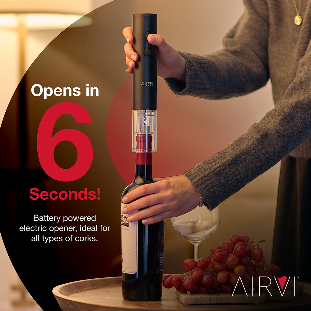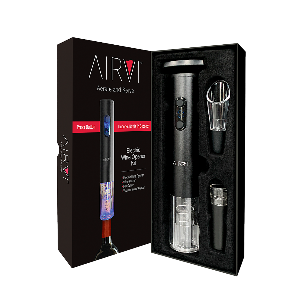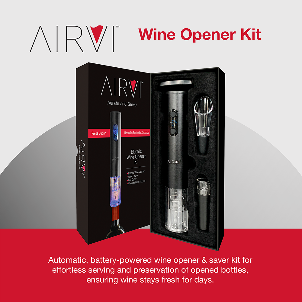 - The Ultimate Wine Companion: Discover the rich flavors of your favorite wines with our AirVi Electric Wine Opener Kit. This comprehensive four-piece collection includes a wine aerator and pump vacuum stopper, tailored to fit standard wine bottles, enhancing the wine's taste and texture while maintaining its freshness.
